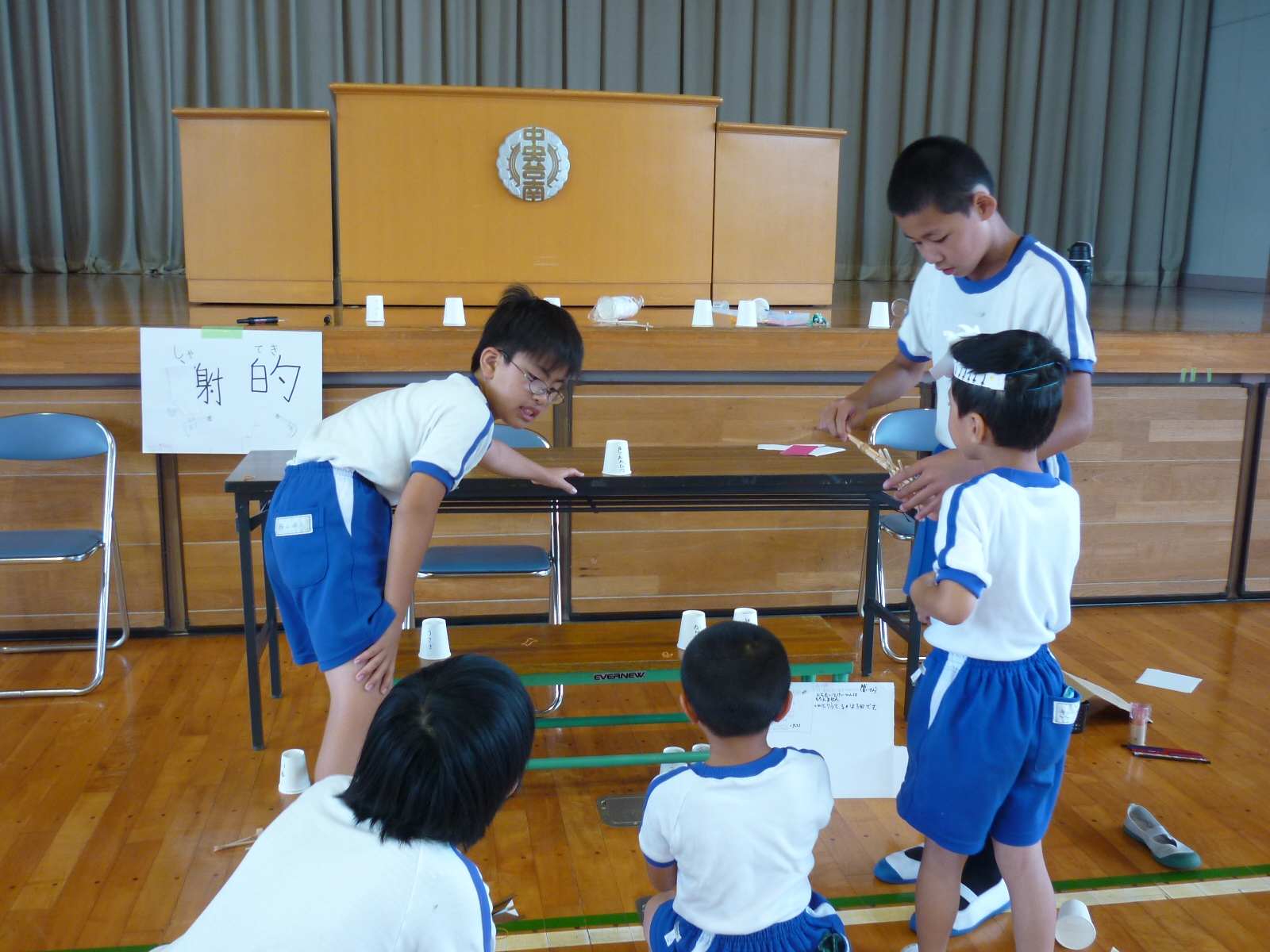 体育館に足を運んでみると、そのレベルの高さに驚きました。手作りのUFOキャッチャー、ペットボトルキャップすくい、射的、くじ引き、輪投げ、紙相撲、紙飛行機飛ばし、箱の中身当て、魚釣り・・・どのブースも工夫を凝らしていました。