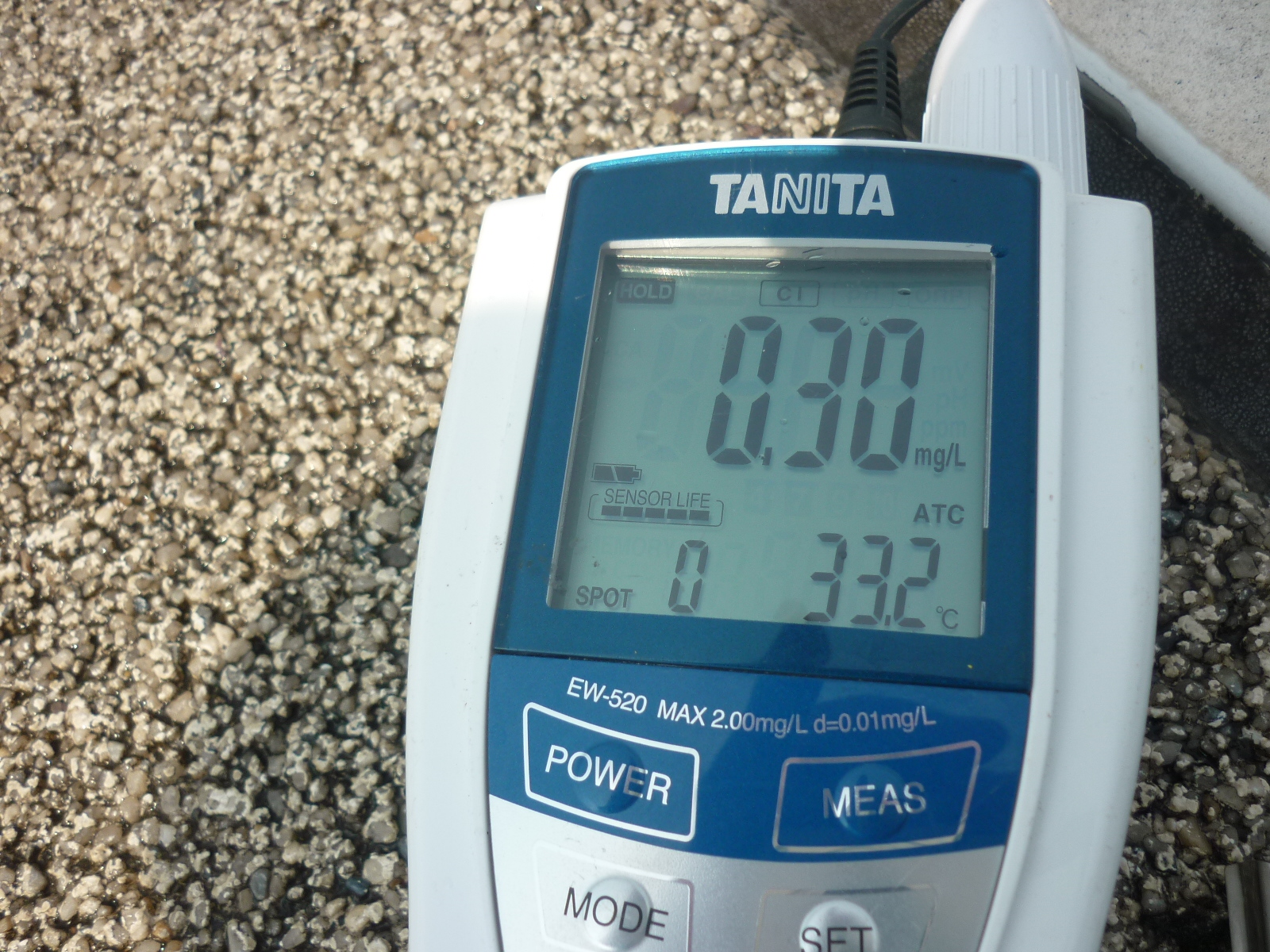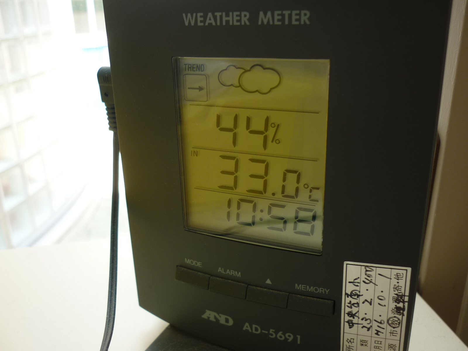 プールから戻ってくる子ども達がみんな「ぬるい~」と言っていたので、5校時に5・6年生が授業中だったので気温・水温を測定してみると「気温34.2度、水温33.2度」・・・。