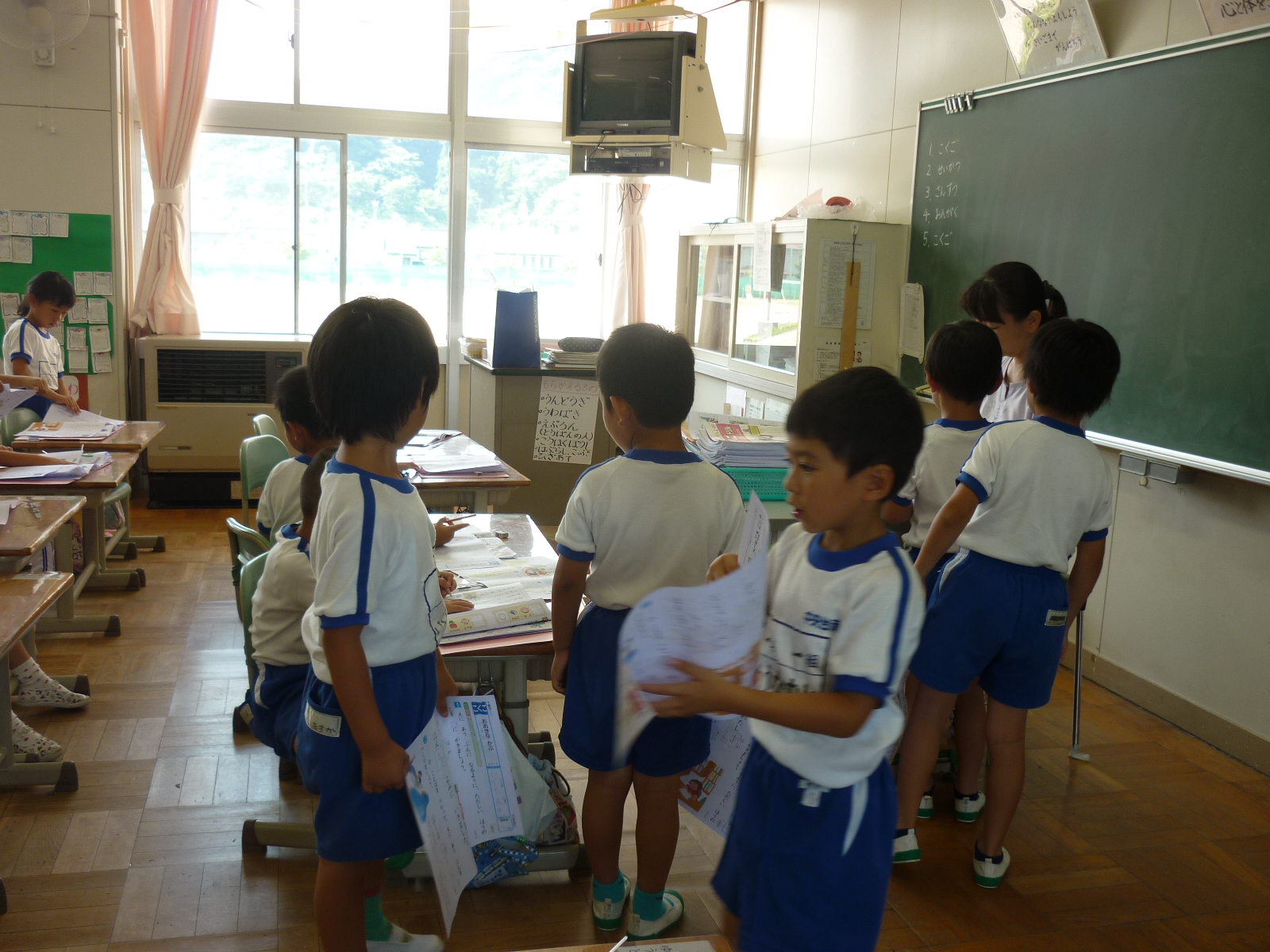 1年生はこれまでのテストの振り返り。近づいていくとみんな「これは95点で、こっちは~」と全てのテスト結果を教えてくれます。高学年になると隠してしまう子も増えますが。