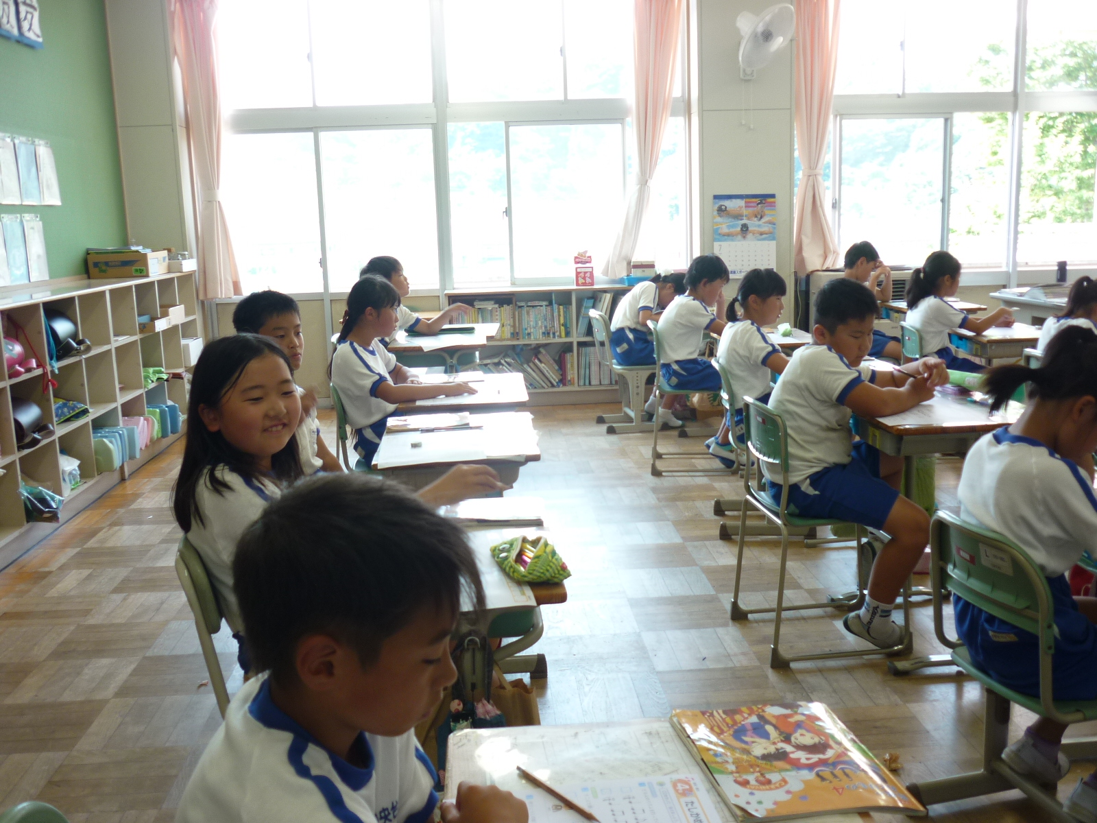 午前中であっさり記録更新・・・。教室、廊下は窓全開、扇風機もフル回転しています。この暑さに負けず、子ども達は教室で1学期のまとめの勉強中です。