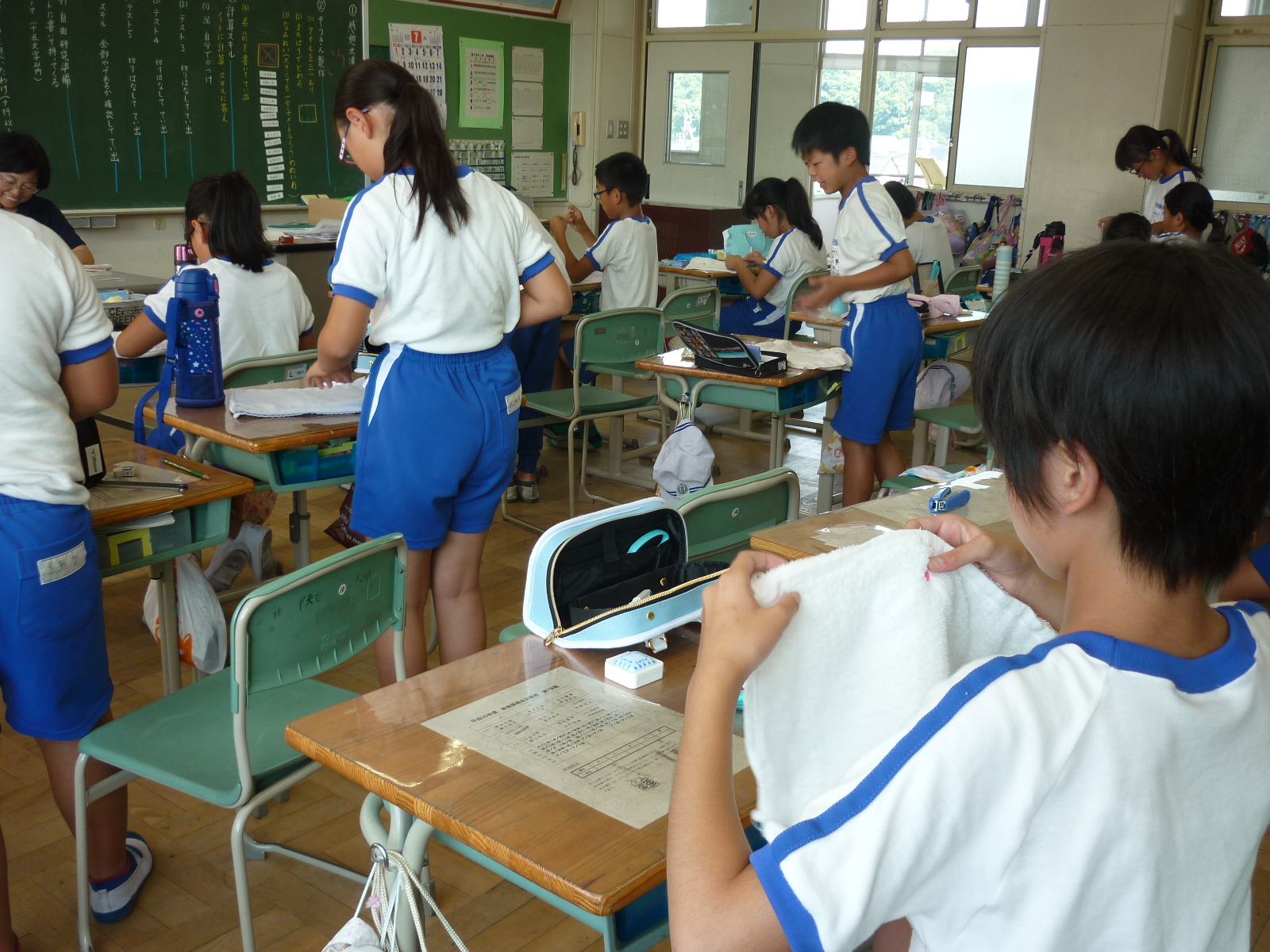 5年生は先日、のぞみの会の皆さんに教わったことを生かして手縫いの雑巾製作。なぜか立ちながら裁縫をする子が多くいました。「この方がはかどります」とのこと。