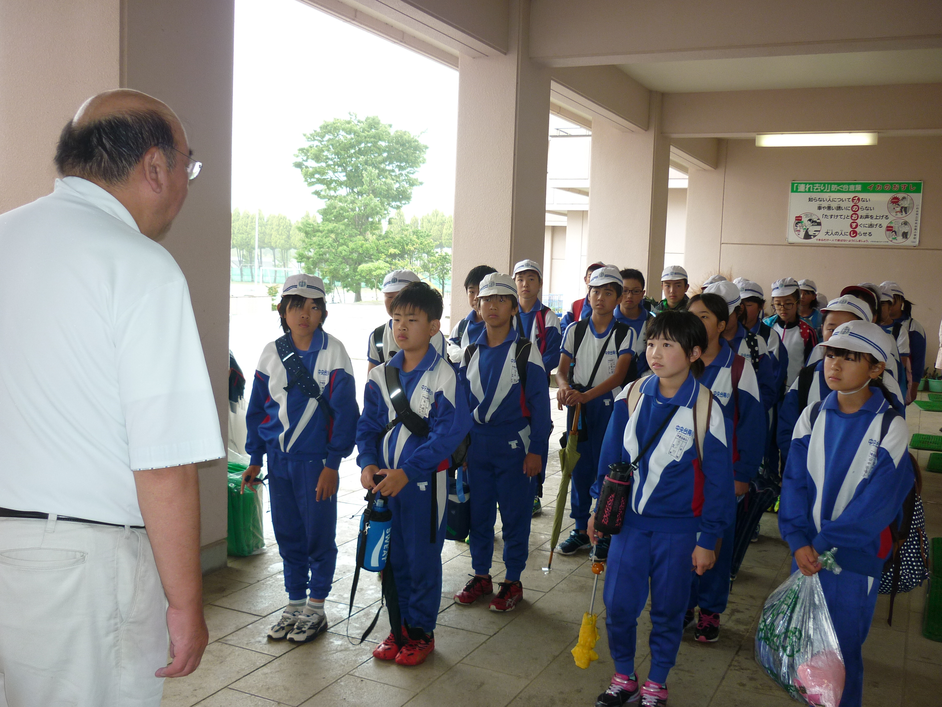 6年生33名、全員出席。注意事項を聞いて出発です。