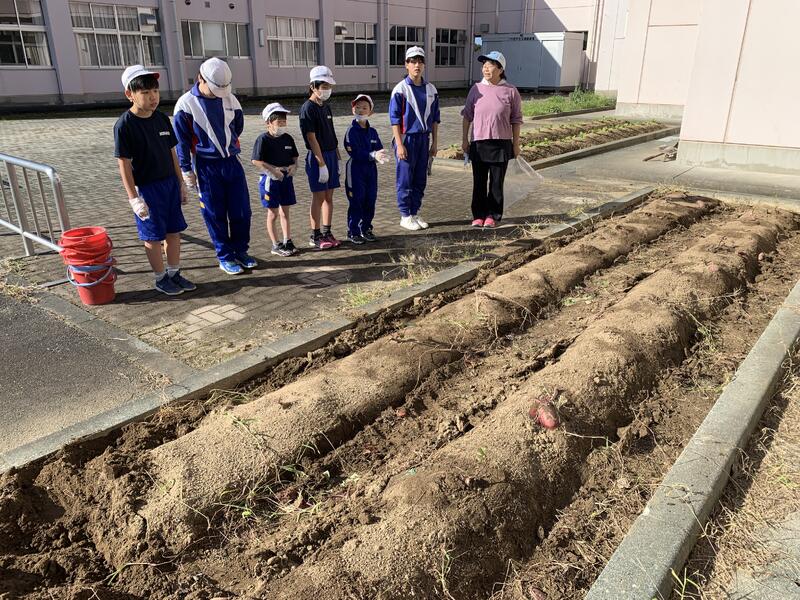 2024年10月21日 17時38分先日、リーズづくりをするためにツル(茎)切ったサツマイモの畑。今日は、みなみ学級全員で力を合わせて、「サツマイモ掘り」を行いました。黒いシートをはがすと、すでに大きいなサツマイモの一部が見えています。早速、掘り出し作業にとりかかりました。