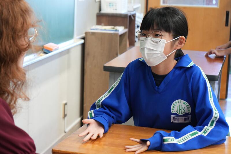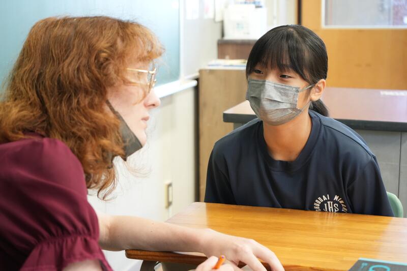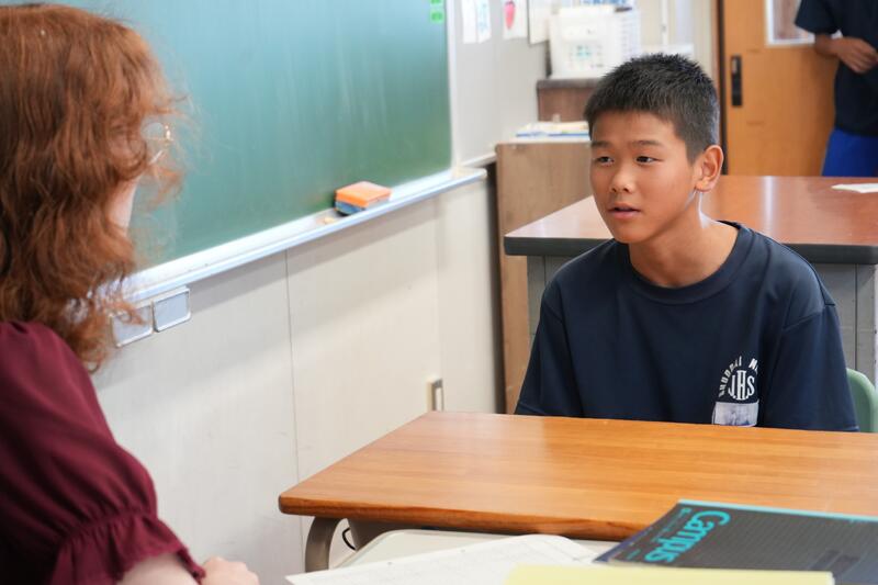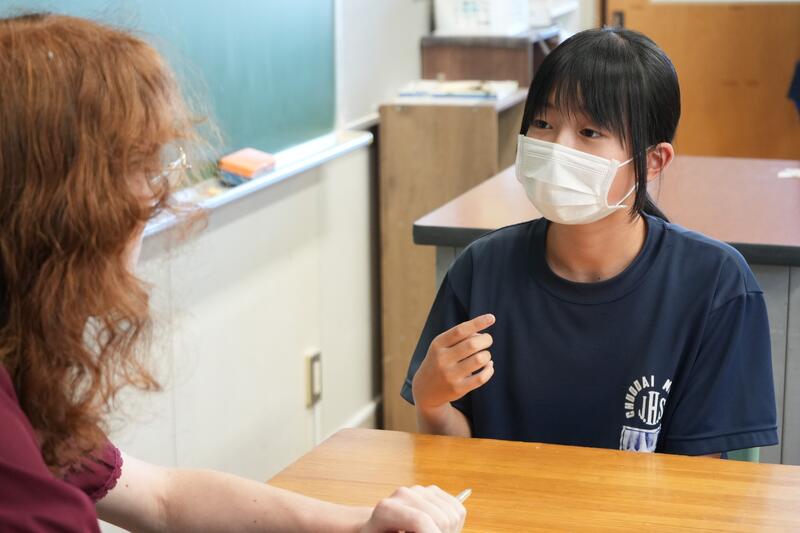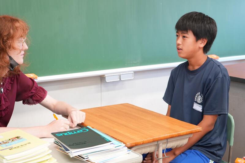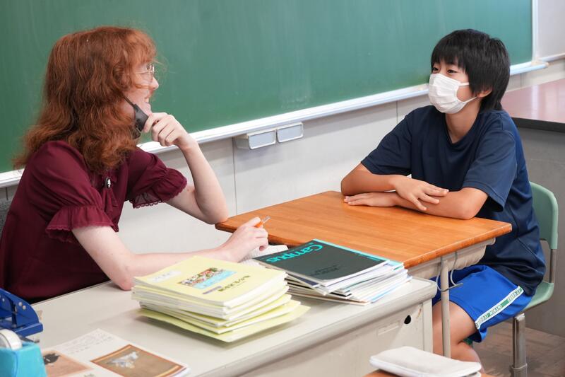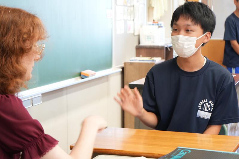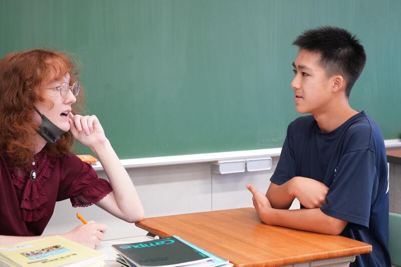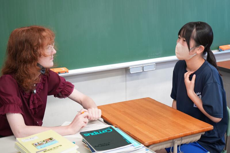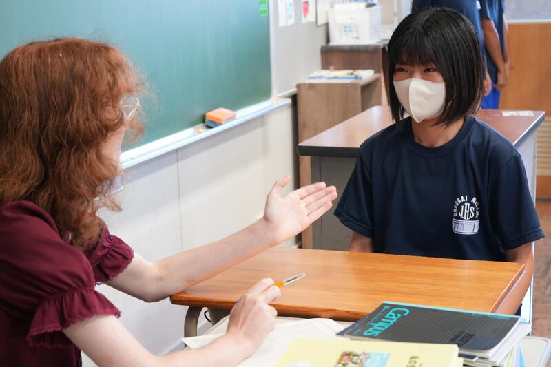 もちろんこれで終わりではありません。「尋ねてみたい」「もっと聞きたい」「自分から伝えたい」…など、生徒たちの思いは様々です。そこで、日頃から1対1の会話をメインに英語学習をしていることから、一人ひとりがコーデリア先生のところにやってきて英会話を楽しみました。この日は26人の生徒が授業を受けていたので1人の持ち時間は90秒にも満たないのですが、生徒たちはそれぞれの思いをもって会話に臨んでいました。