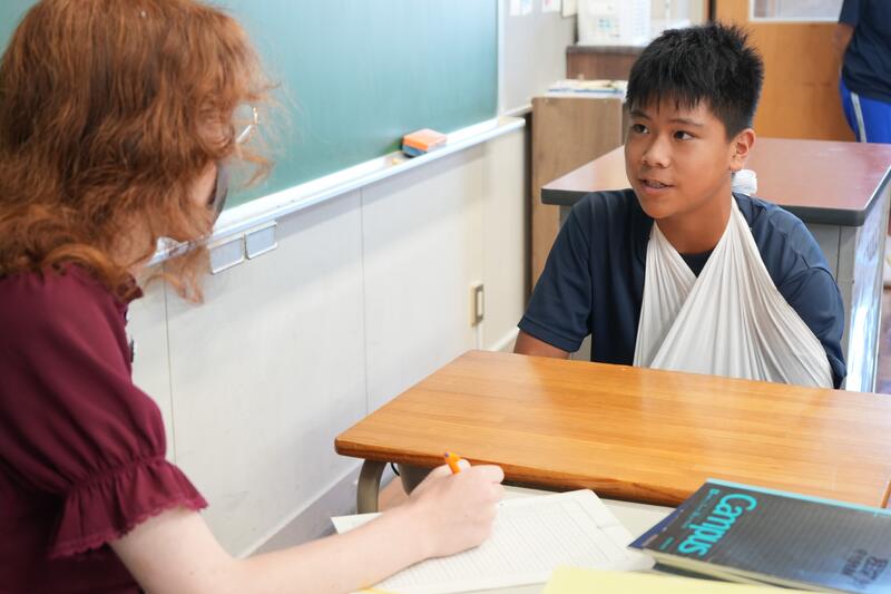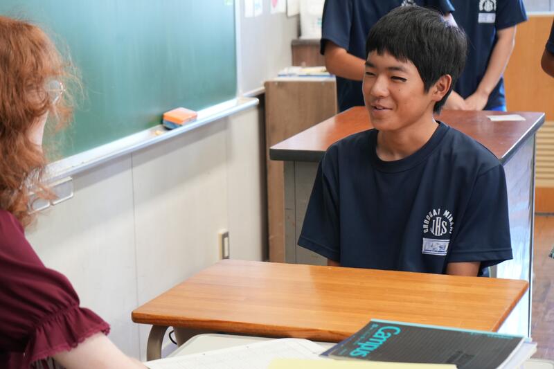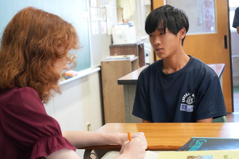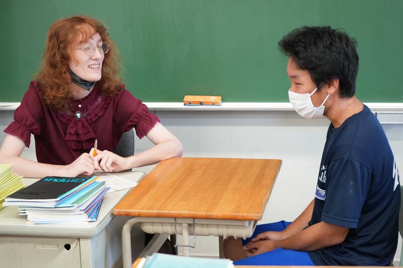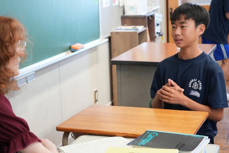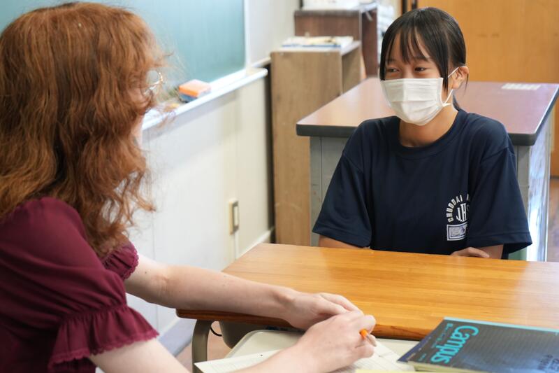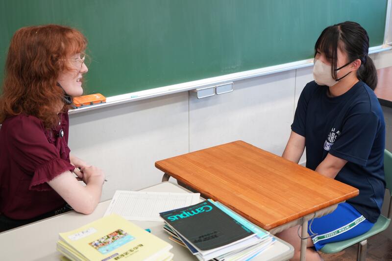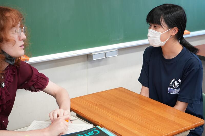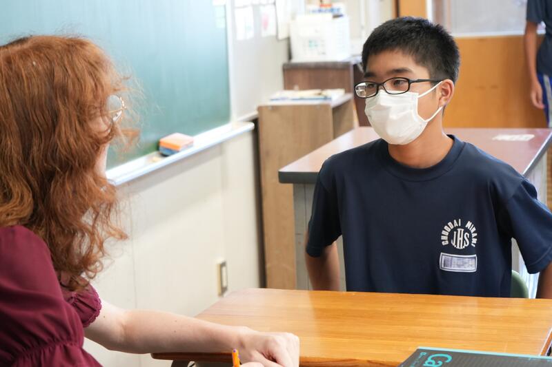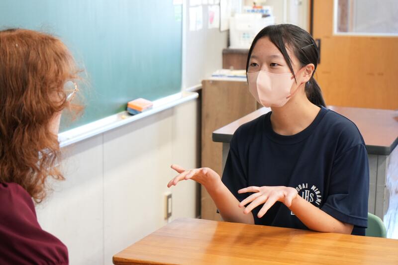 もちろんこれで終わりではありません。「尋ねてみたい」「もっと聞きたい」「自分から伝えたい」…など、生徒たちの思いは様々です。そこで、日頃から1対1の会話をメインに英語学習をしていることから、一人ひとりがコーデリア先生のところにやってきて英会話を楽しみました。この日は26人の生徒が授業を受けていたので1人の持ち時間は90秒にも満たないのですが、生徒たちはそれぞれの思いをもって会話に臨んでいました。