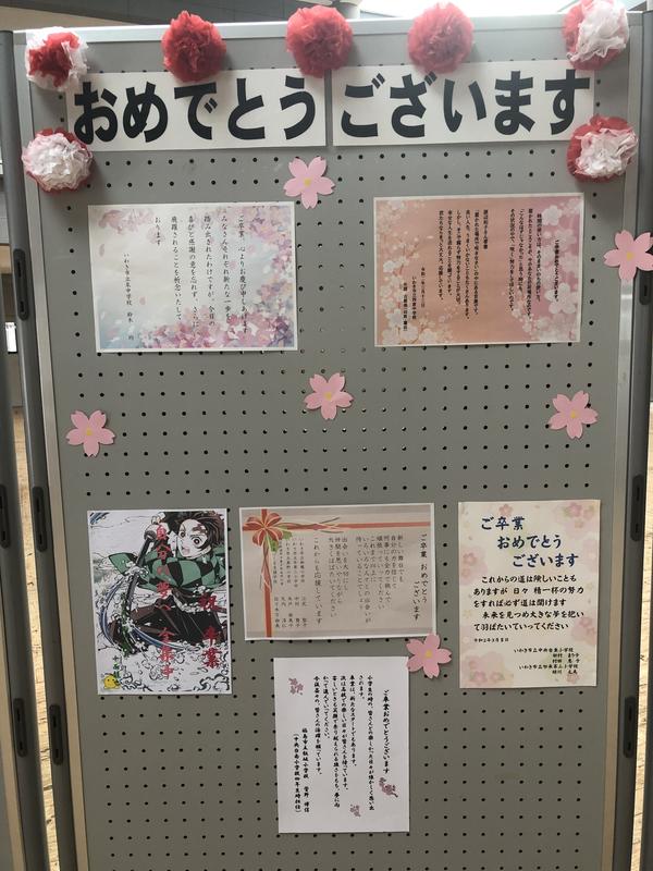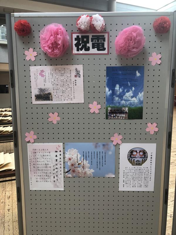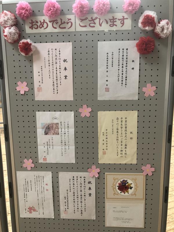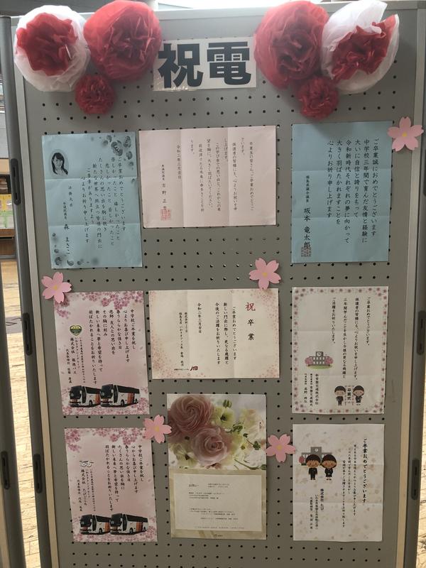 卒業式 祝電 2020年3月13日 08時12分 いよいよ卒業式の日となりました。ひと足お先に祝電披露です 懐かしい先生方からのお祝いの言葉。卒業生に届きますように。 続きを読む じっくりご覧ください!じっくりご覧ください!今日参加できなかった在校生の皆さんもぜひ、ご覧ください。 閉じる