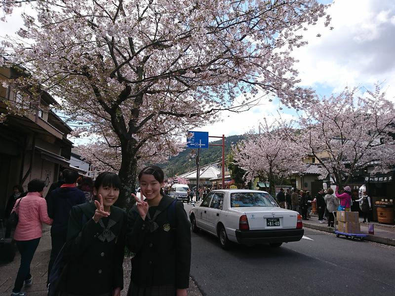 修学旅行2日目の班別自主研修の様子です。雨も上がり、京都の桜を眺めながら、町歩きを楽しみました。