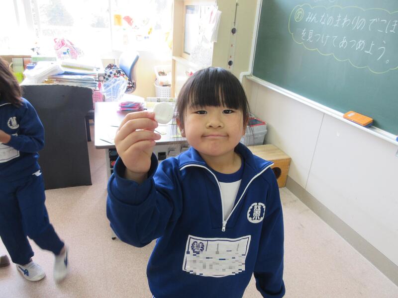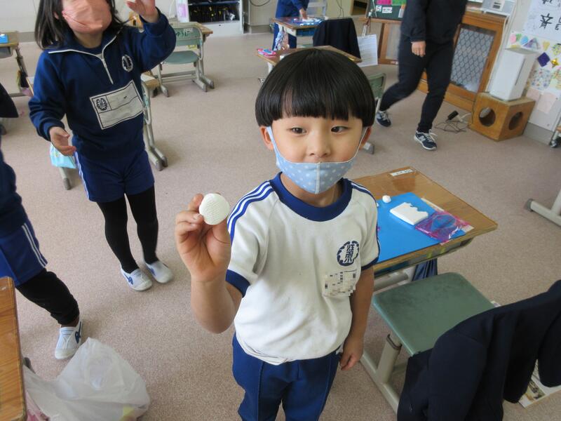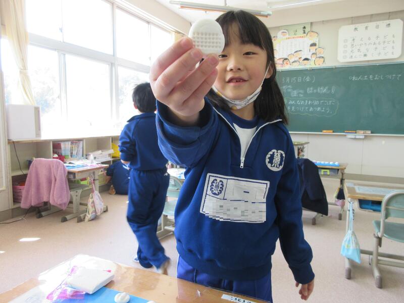 1年生は図画工作科の学習です。紙粘土をでこぼこのところに押し当てて、その模様から想像を広げて楽しんでいました。「校長先生、見て見て!!」「これは、お花だよ!」などといろいろなでこぼこ模様を見せてくれました。子どもって大人が気づかないようなところのでこぼこを発見し、その模様から豊かに想像するんですね。みんなとっても楽しそう
