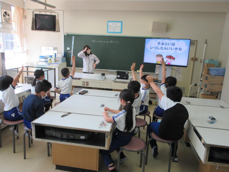 2年生は学級活動です。今回は正しい手の洗い方を学習していました。