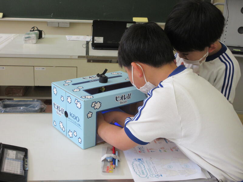 しっかりと洗ったはずなのに、所々ばい菌が残っていることに気づく2年生。そうなんですよ、だから、丁寧かつこまめに行うことが大切なんですね。素晴らしいことを学んだ2年生でした