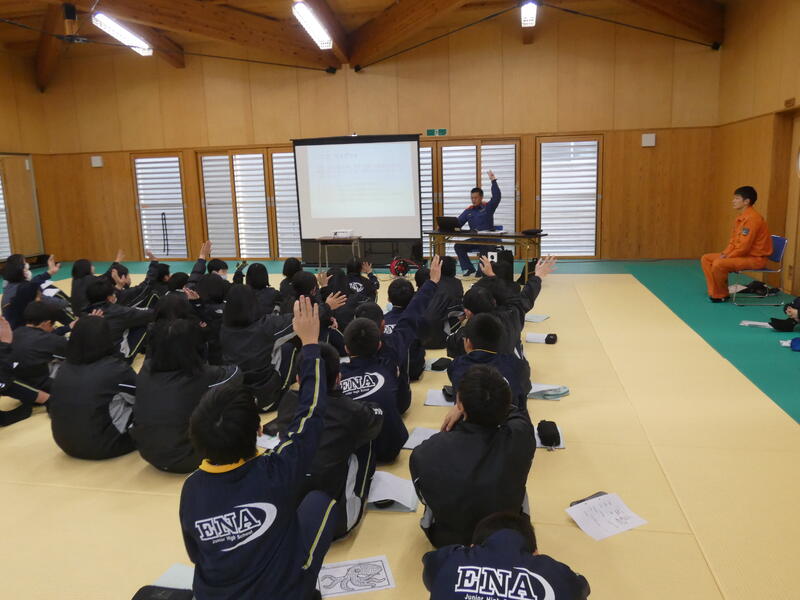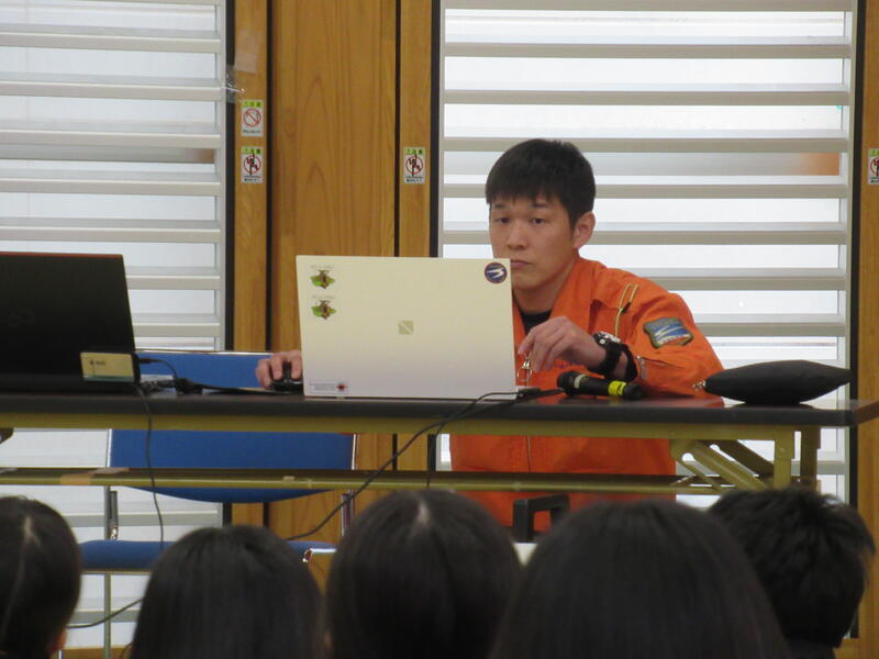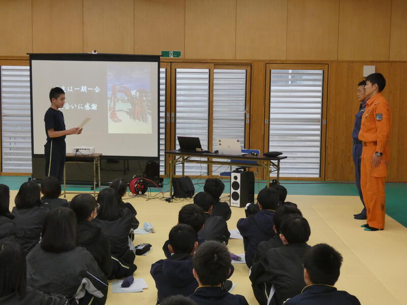 2025年1月15日 08時28分1月14日(火)の6時間目、一年生を対象に防災とボランティア活動についての講話がありました。小名浜消防署江名分遣所長、空岡実さんと本校出身の小名浜消防署消防士、新妻拓哉さんからお話をいただきました。新妻さんからは現在も続ける石川県能登地方でのボランティアの活動についてもお話がありました。お話しの中で、災害時、消防などの方に助けてもらえる割合が10%、地域からの助けが20%、自身で守るが70%という事実に驚きがありました。子供達は、自分で自身を守らなければならないことを自覚し、自助と共助の精神について深く学ぶことができました。