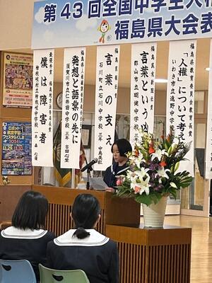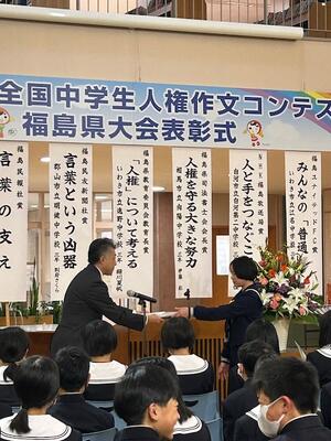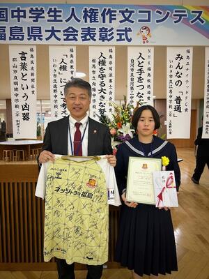 2024年11月25日 19時06分11/25(月)三春中で行われた第43回人権作文コンテスト福島県大会表彰式で、3年上遠野心優さんが「福島ユナイテッドFC賞」を受賞し、表彰されました。その後、他の受賞者とともに作文発表を行いました。人権についてさまざまな意見の作文が発表され、大変すばらしい表彰式となりました。式には車いすラクビーでパラリンピックに出場した橋本勝也さんも参加し、メッセージをいただきました。心優さんは、福島ユナイテッド社長の鈴木様より副賞もいただきました。