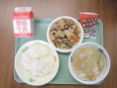 メニューはご飯、牛乳、たけのこのおかか煮、呉汁、フィッシュビーンズ