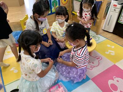 怪我をしたお友達に絆創膏を貼ってあげていました