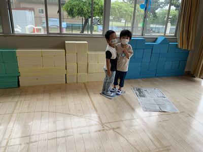 お遊戯室で新聞遊びをしました