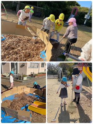 先生から熊手の使い方を教えてもらう年長さんもほうき、ちりとりの使い方も上手になってきました。