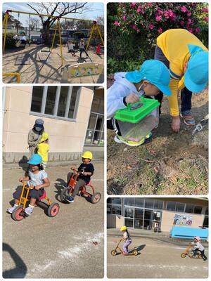 外遊びでは、連日大盛況の落ち葉のプールすべり台や、虫捕り、三輪車で遊びました