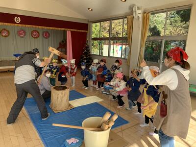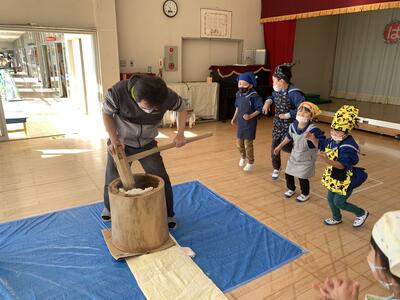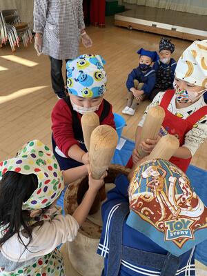 そらぐみさんから順番にもちつきをおこないました!みんな表情は真剣です!