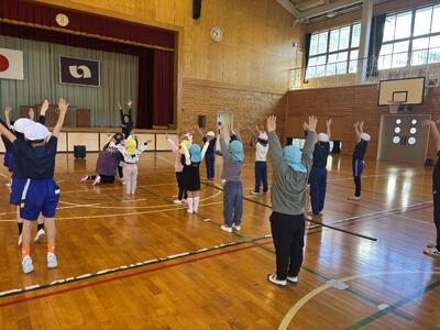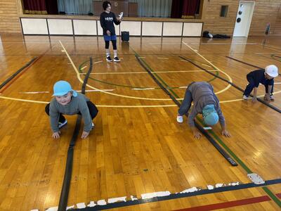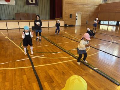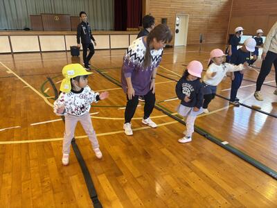 音楽に合わせてジャンプしながら、いろいろな動きに挑戦しました
