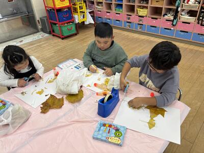 たくさん拾ったあとは、葉っぱをつかって製作をしました