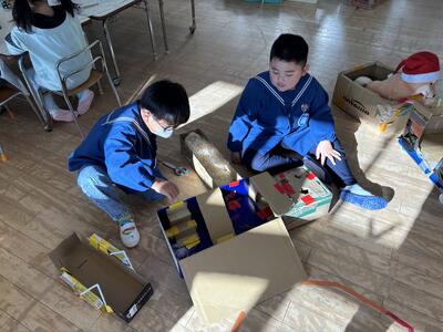 カマキリのお家づくりでは、お友達とアイディアを出し合いながら作っています