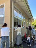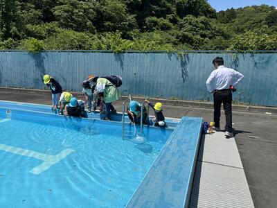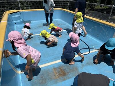 たわしでゴシゴシ…みんなのおかげでピカピカのプールになりました