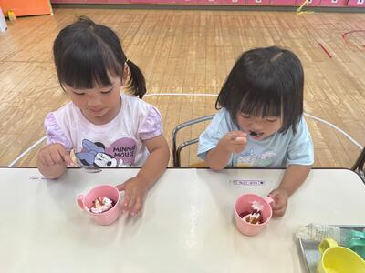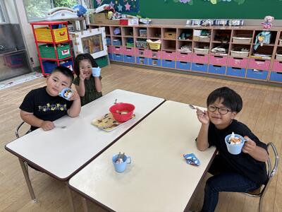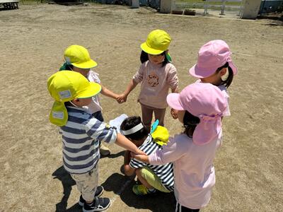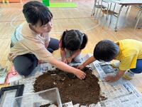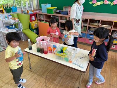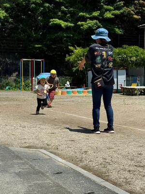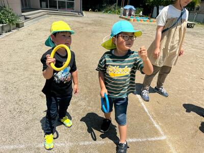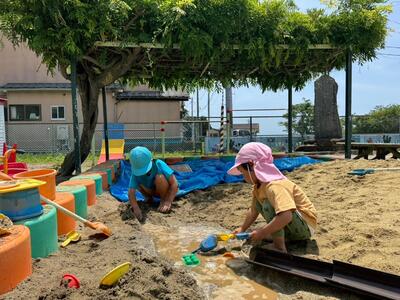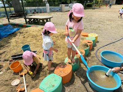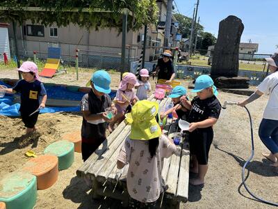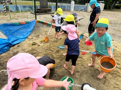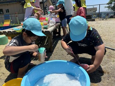 その後は、お外で遊びました。戸外遊びもミッションの一つです暑い中でしたが、シャボン玉や水・泥遊びを楽しみました。