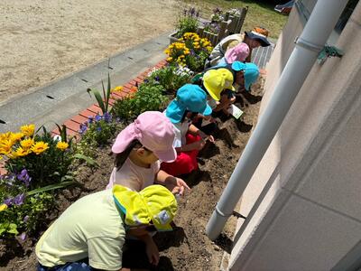 花壇に花の種を植えましたどんなお花が咲くかなぁ?