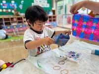 年中組さんも、折り紙をちぎって、貼って何かを作っています