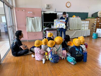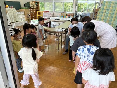 避難した後は、園長先生からダンゴムシのポーズや「おかしも」のお約束を教えてもらいました