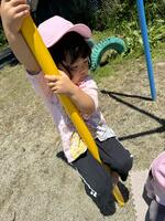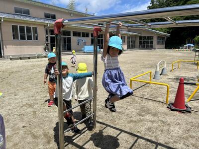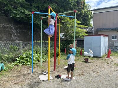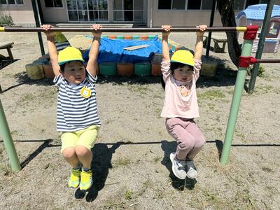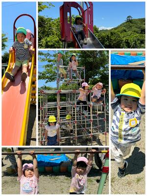 年長組さんがなかよしタイムで小学校に行っている間に、年少組、年中組さんは、固定遊具に挑戦!!