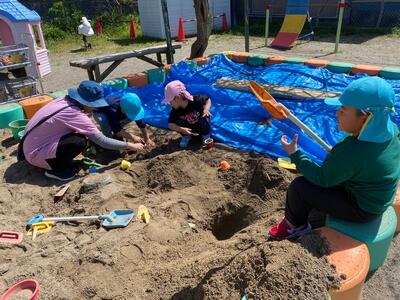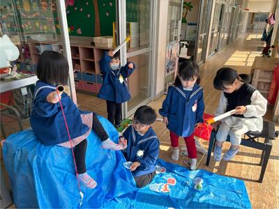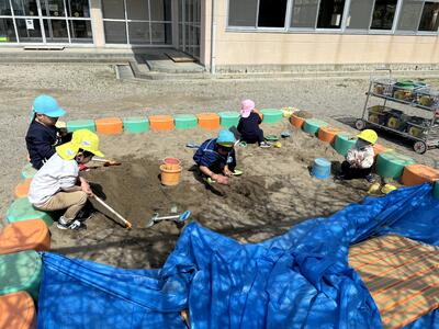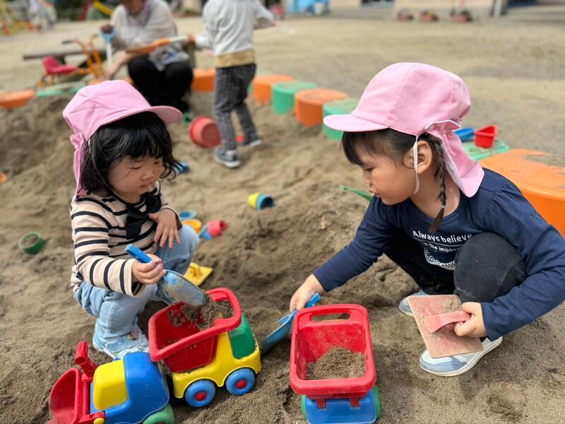 今日は暖かかったので、たっぷり戸外遊び!砂場では、砂に水を混ぜてままごとや泥だんご作りを楽しみました