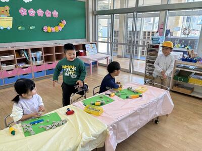 まずは遊戯室で道路の歩き方や車の秘密、標識についてお勉強をしましたよ