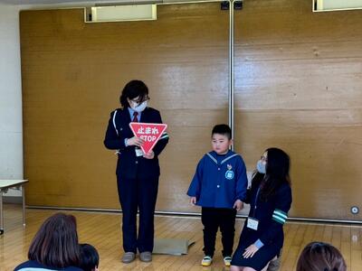 道路の右側を歩く、一時停止など、安全に歩くためのお約束をしました
