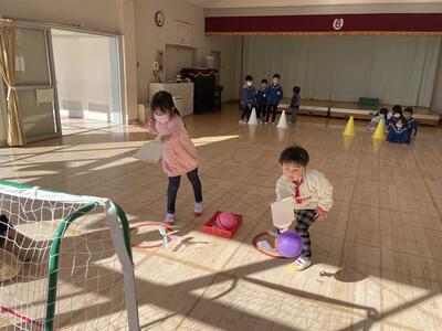 羽子板をバトンに、羽をゴールにいれたら次のお友達にバトンタッチ♪