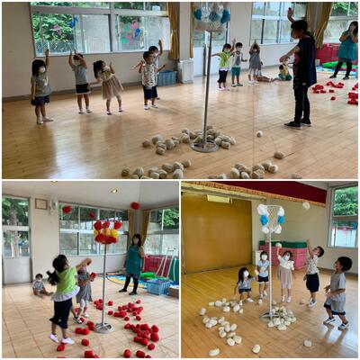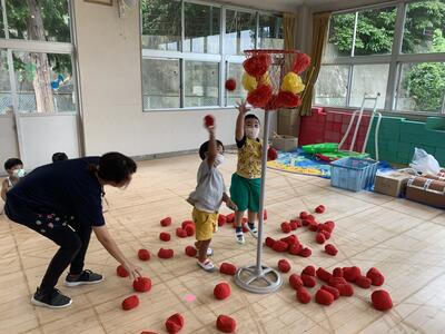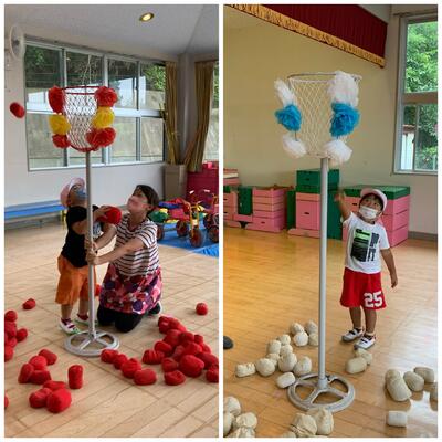 お遊戯室では、バナナ玉入れをしました