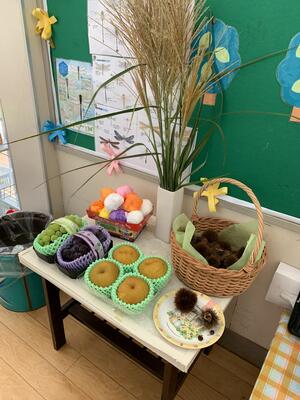 幼稚園に戻り、とってきたすすきと栗、そらぐみが作ってくれたカラフル団子を飾りました