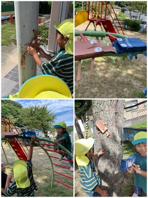 作ったクワガタとカブトムシを本当の木にくっつけたいと張り切って遊んで出した