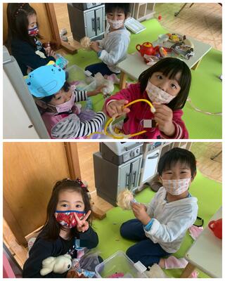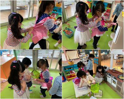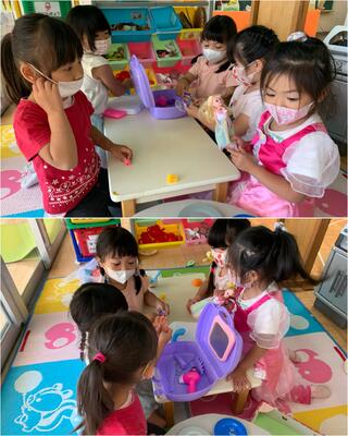ままごとではお化粧ごっこ中です。みんな同じものが使いたい。でも誰から使う?順番を話し合います。今日はジャンケンで使う順番を決めました。