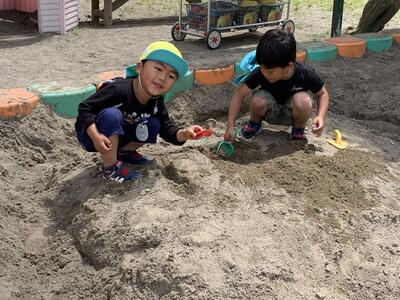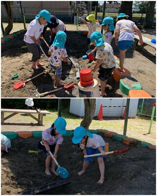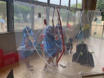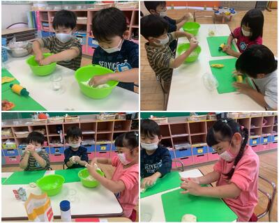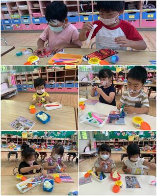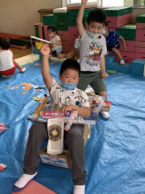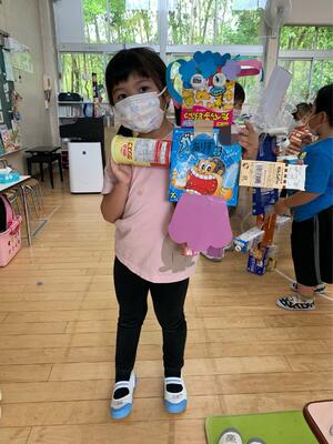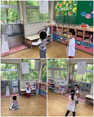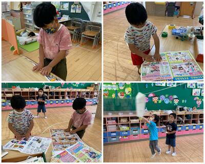 怪獣を倒す剣作りでは、細く作るために工夫したり、どうやったら怪獣が倒せるのかつよく叩いてみたり、考えながら楽しく遊ぶ姿が見られました