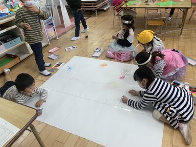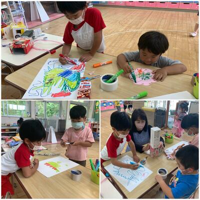 今日は怪獣ごっこの怪獣を子どもたちが描きました
