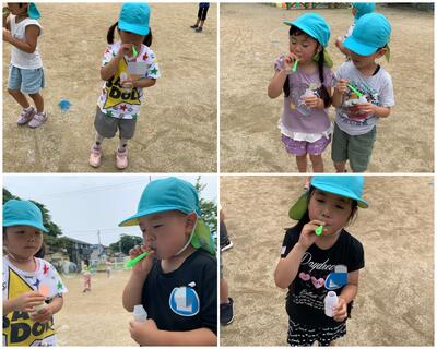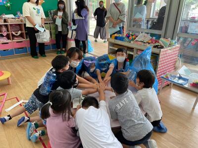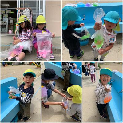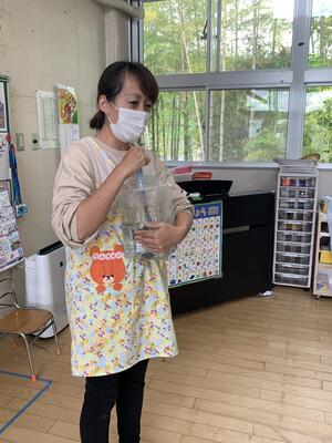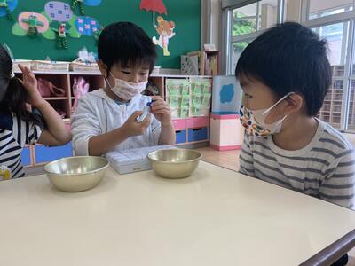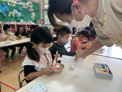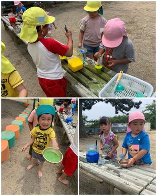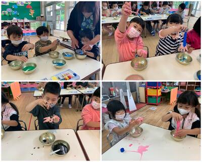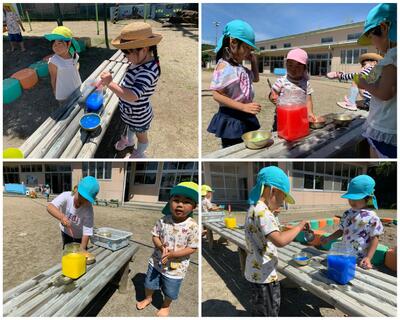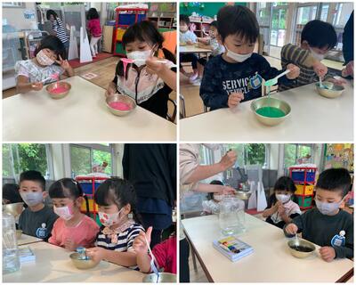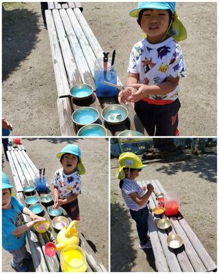 色水遊びでは…、あえて先生が「〇〇味のジュースください」と注文します。すると子どもたちは、どうやったらその色ができるかを考えて試します。これは違った…と試行錯誤を繰り返す中で「出来た!」と発見を喜ぶ姿につながりました。