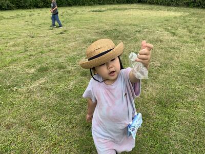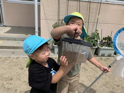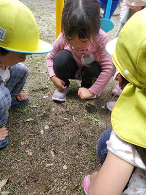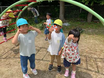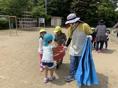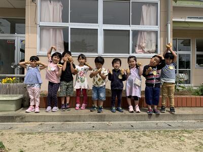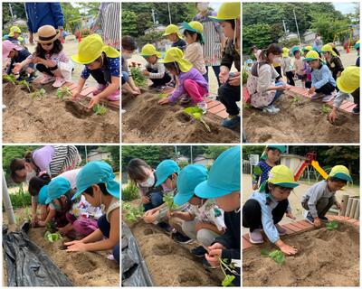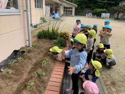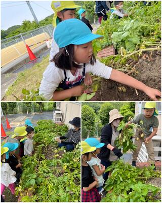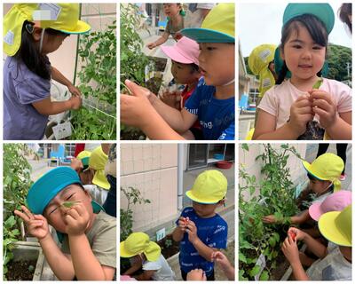 戸外遊びでは、ひまわり組さんのトマトとえんどう豆が収穫できました