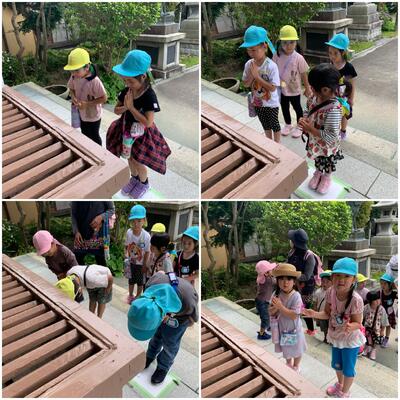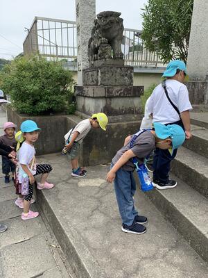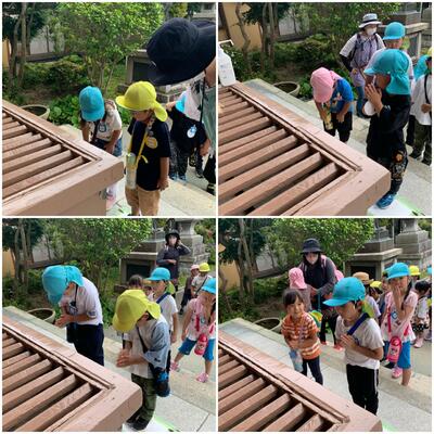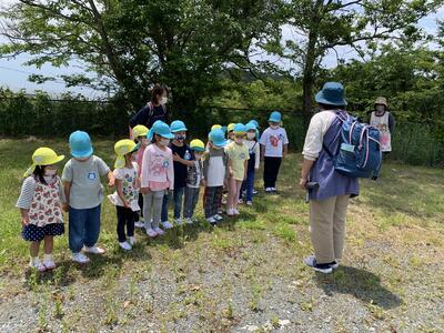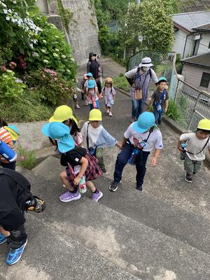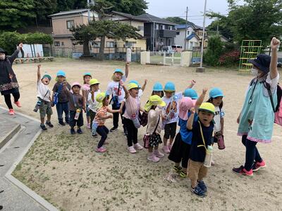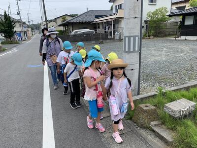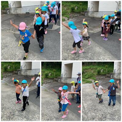そらぐみさんが道路側を歩き、小さい組のお友達を守ります