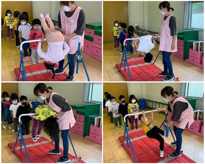 (前回りに挑戦する子、逆上がりに挑戦する子、ぶたのまるやきに挑戦する子 など)