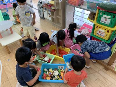 ぐちゃぐちゃになっていました。どうすればいいかな?みんなで考え、「ちゃんと同じカゴに戻す!」と気づき協力して綺麗にお片付けしました