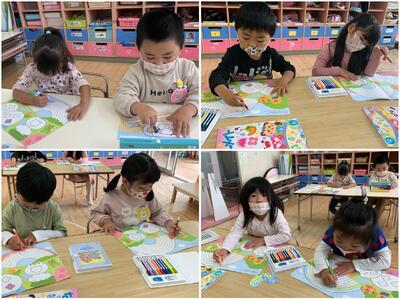 うさぎ・ひまわり組は月間絵本のぬりえをおこないました