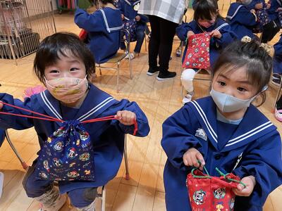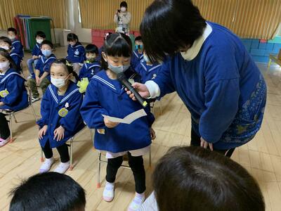 最後に園長先生からお年玉でコマのプレゼントがありました。代表のお子さんが受け取りました