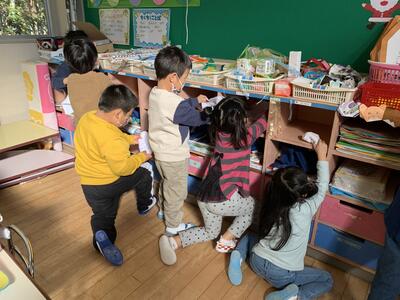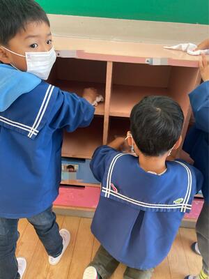 ロッカーや引き出し、ままごと道具など丁寧に拭き掃除をしました!綺麗になると気持ちがいいですね