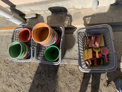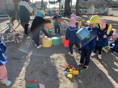 まずは戸外で砂場道具の大掃除をしました。